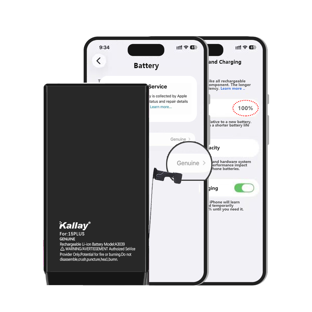 The KALLAY New Diagnostic-Compatible High-Capacity show Genuine Battery for iPhone 12-15Pro Max supports full iOS diagnostics and displays as genuine inside the system. It uses brand-newA+ pure-cobalt cells, offering higher capacity, stronger endurance, and stable performance close to the original. Ideal for repair shops needing reliable, premium-grade replacement batteries.